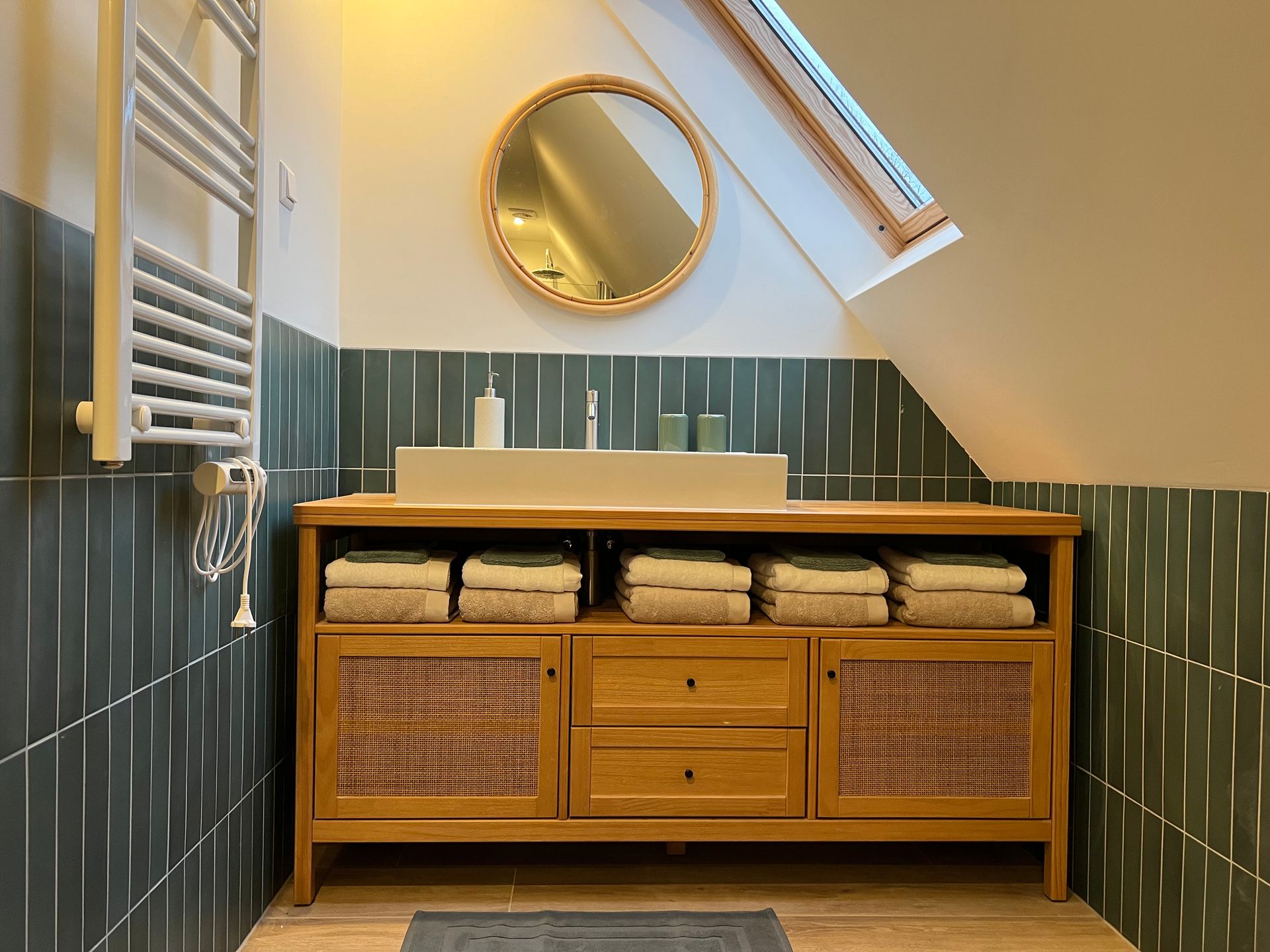 with sink, toilet, rainshower, towels and radiator.